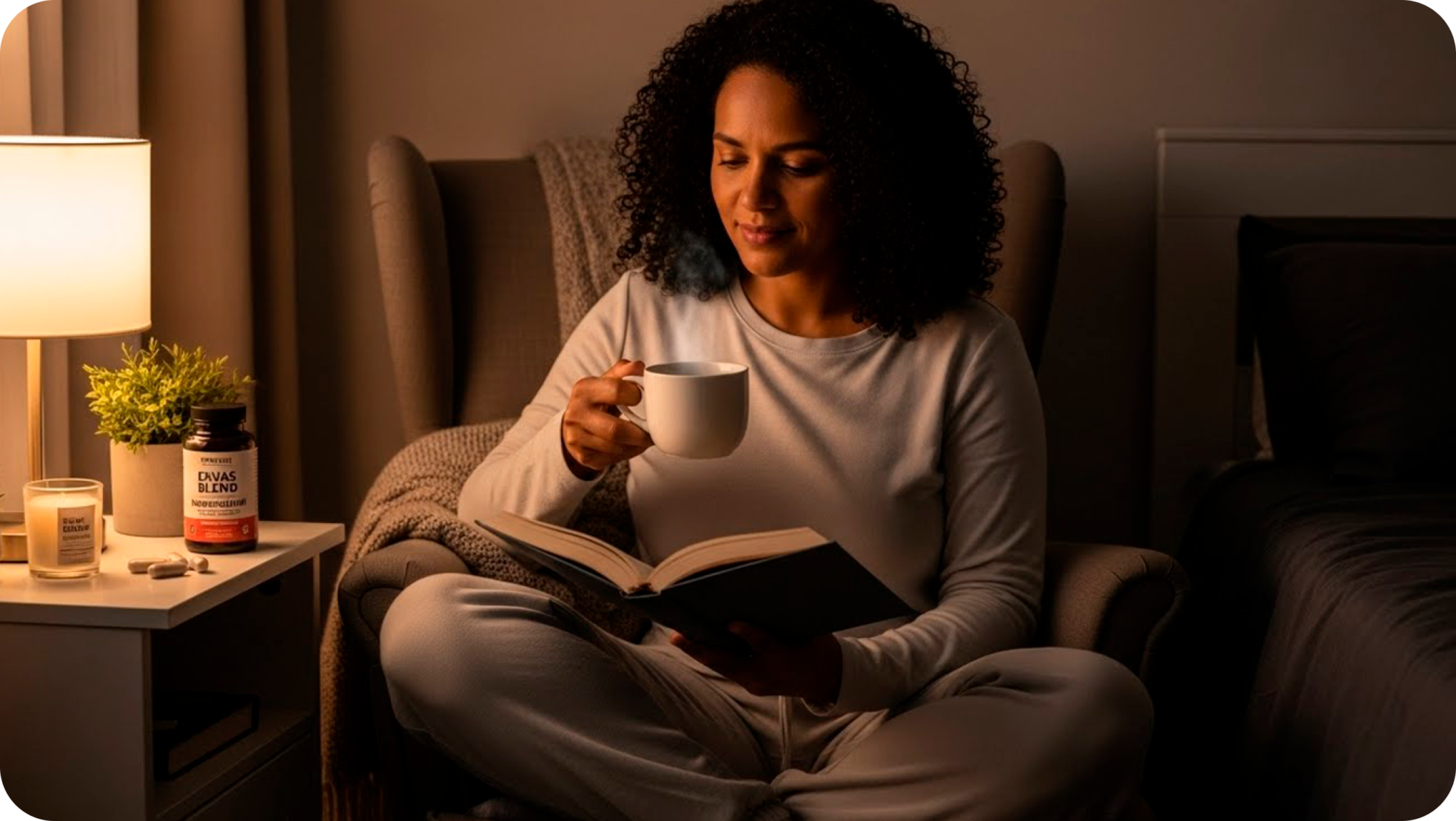 Muitas vezes, mesmo com o ambiente certo, a mente continua acelerada. É aqui que a nutrição entra como um “interruptor” suave. Diferente de remédios tarja preta que causam dependência e ressaca no dia seguinte, os ativos naturais ajudam o corpo a encontrar seu próprio caminho para o relaxamento.